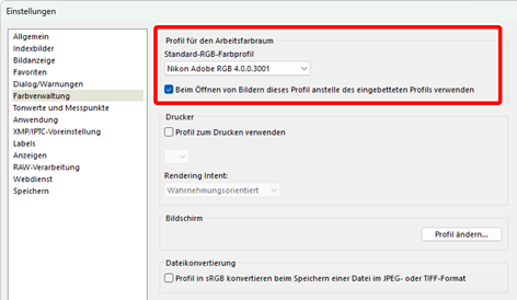 - Wenn nur [Beim Öffnen von Bildern dieses Profil anstelle des eingebetteten Profils verwenden] ausgewählt ist, wird während des Exports das [Standard-RGB-Farbprofil] (oder in macOS [Standard-RGB-Profil]) in die Bilder eingebettet.