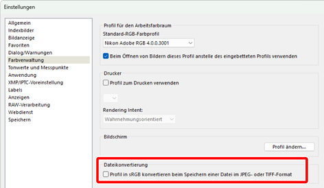 Entfernen Sie das Häkchen von [Profil in sRGB konvertieren beim Speichern einer Datei im JPEG- oder TIFF-Format] bei [Dateikonvertierung] im Bereich [Farbverwaltung].