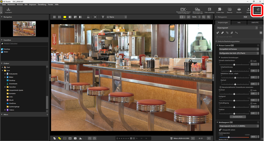 Um die aktuell ausgewählten Bilder im JPEG-, HEIF- oder TIFF-Format zu exportieren, klicken Sie auf [Exportieren] in der Symbolleiste. Wenn Sie RAW-(NEF/NRW-)Bilder und NEFX-Bilder (verschmolzene Pixelverlagerungsfotos) als JPEG-, HEIF- oder TIFF-Dateien exportieren, können Sie diese mit anderer Software verwenden. Auf Wunsch können ganze Ordner für den Export ausgewählt werden.