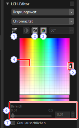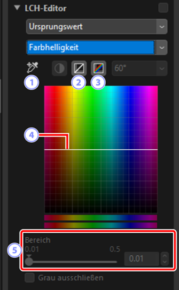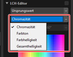 Nehmen Sie die Anpassungen für die Helligkeits-, Chromazitäts- und Farbtonkanäle vor. Wählen Sie über das Menü im LCH-Editor-Werkzeug einen Kanal aus. Die verfügbaren Optionen sind vom ausgewählten Kanal abhängig. Das LCH-Editor-Werkzeug wird nicht angezeigt, wenn [Anpassen mit HDR] aktiviert ist.