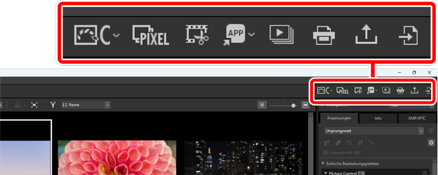 - Öffnen Sie die ausgewählten Bilder mit anderer Software. Programme lassen sich mittels [Anwendung] im Voreinstellungen-Dialogfeld hinzufügen (0 Das Voreinstellungen-Dialogfeld, [Anwendung]).
