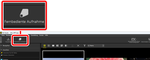 Falls NX Tether installiert ist, lässt sich dieses Programm durch Klicken auf [Fernbediente Aufnahme] in der Symbolleiste starten.