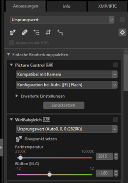 Die Anpassungs-/Infopalette