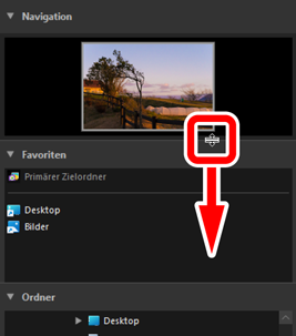 Ziehen Sie an den Rändern der Unterpaletten [Navigation], [Favoriten], [Ordner] und [Alben], um deren Größe einzustellen.