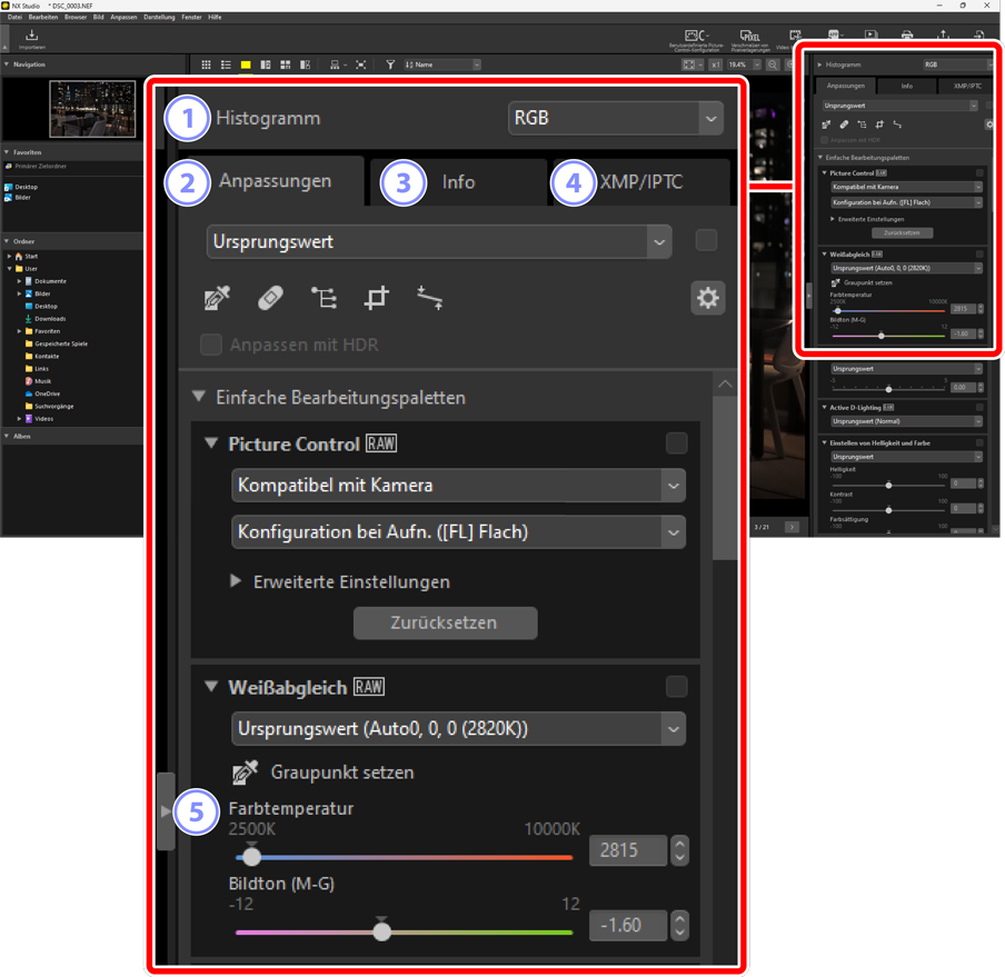 - Zeigt Bildinformationen und Anpassungen für die ausgewählten Bilder an.