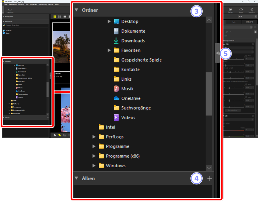 - Eine hierarchische Anzeige der Ordner auf dem Computer. Klicken Sie auf die Ordner, um die darin enthaltenen Bilder im Anzeigebereich anzuzeigen.