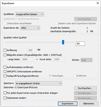 Nachdem Sie die Bilder verbessert haben, können Sie sie als JPEG-, HEIF- oder TIFF-Dateien unter neuen Namen speichern. Die Bilder können dann mit anderer Software verwendet werden.