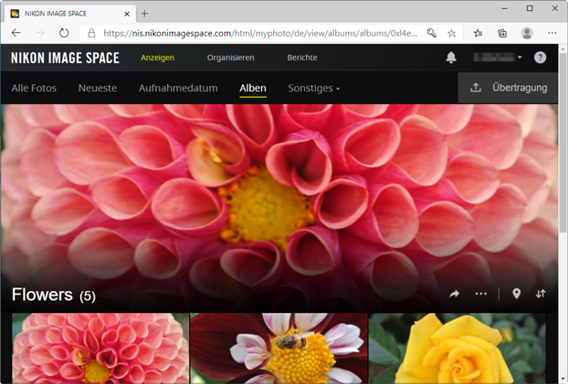 Bilder, die in den entsprechenden Formaten gespeichert wurden, können direkt auf NIKON IMAGE SPACE hochgeladen werden (0 Webdienste, NIKON IMAGE SPACE). Sie können die Bilder auch ausdrucken und mit Ihrer Familie und Freunden teilen (0 Bilder drucken).