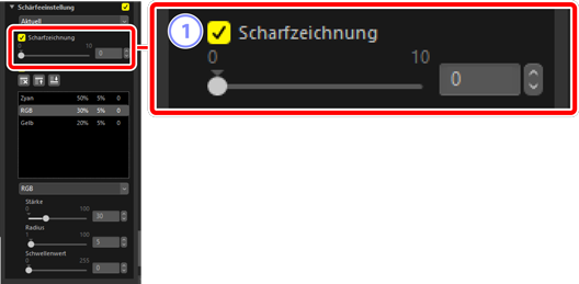Erhöhen Sie die Schärfe, um die Ränder stärker hervortreten zu lassen. Verwenden Sie [Unscharf maskieren], um den Kontrast der Kanten zu erhöhen, während die anderen Bereiche unberührt bleiben. Dieses Werkzeug wird nicht angezeigt, wenn [Anpassen mit HDR] aktiviert ist.