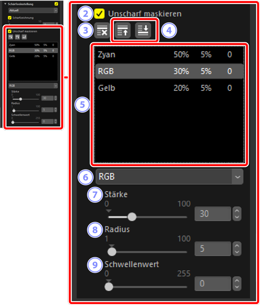 - Verschieben Sie die aktuell ausgewählte Maske in der Liste Unscharf maskieren nach oben oder unten.