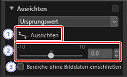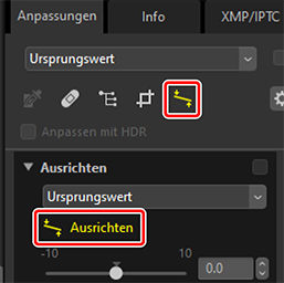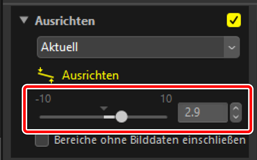 Das Bild wird um bis zu ±10° gedreht, um die Referenzlinie horizontal oder vertikal auszurichten. Der Drehungswinkel wird im Textfeld neben der Anpassungspalette angezeigt.