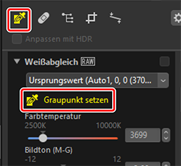 Wenn Sie mit dem Graupunkt-setzen-Werkzeug auf eine beliebige Stelle im Bild klicken, wird der Weißabgleich so eingestellt, dass das aufgenommene Pixel eine neutrale (weiße oder graue) Farbe annimmt. Farbstiche können so mit einem einzigen Klick entfernt werden.