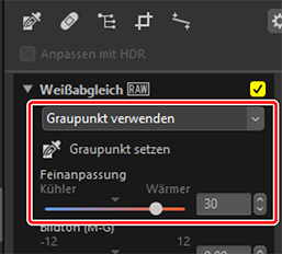 Wenn [Graupunkt verwenden] im Weißabgleichsmenü erscheint, ändert sich [Farbtemperatur] auf [Feinanpassung] und der Weißabgleich kann mit dem Schieberegler fein abgestimmt werden.
