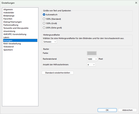 - Setzen Sie alle Punkte in der [Anzeigen]-Kategorie auf ihre Standardwerte zurück.