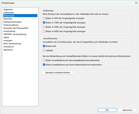 - [Auswählen des Ansichtsmodus, der durch Doppelklick auf Indexbilder erscheint]: Wählen Sie aus, ob durch Doppelklicken auf ein Indexbild im Indexbild-Browser oder in der Indexbild-Liste das Bild in der Vollbild- oder Bildansicht angezeigt wird.