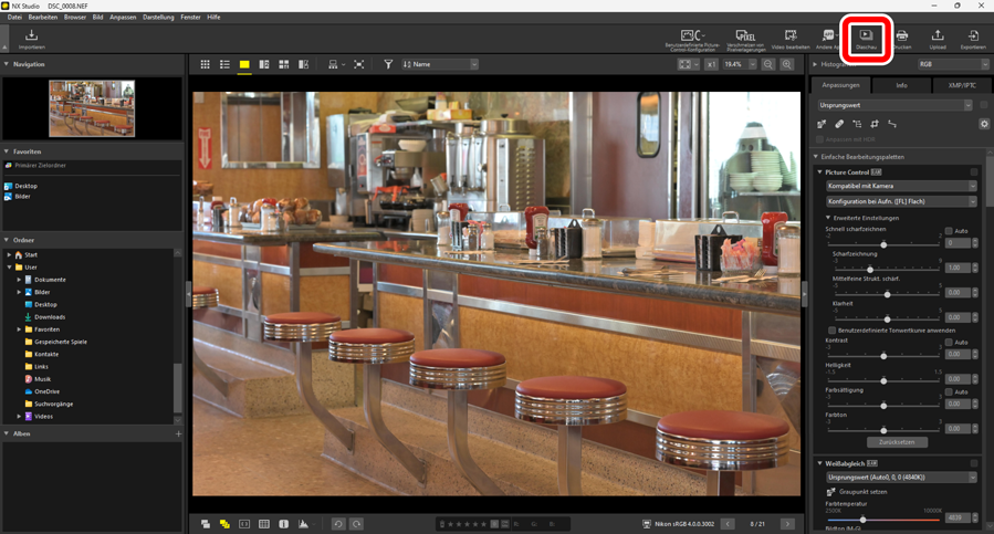 Um die aktuell ausgewählten Bilder oder die Bilder im aktuellen Ordner in einer Diashow anzuzeigen, klicken Sie auf [Diaschau] in der Symbolleiste.