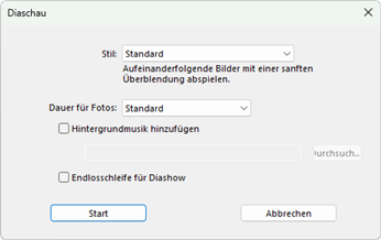 Die Optionen im [Diaschau]-Dialogfeld geben an, wie lange die Bilder angezeigt werden, die Übergänge zwischen den Bildern und andere Einstellungen der Diashow. Nachdem Sie die Einstellungen vorgenommen haben, klicken Sie auf [OK], um die Diashow zu starten.