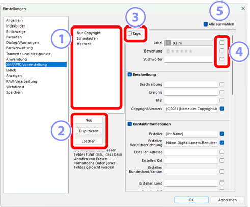 - Wählen Sie alle Punkte in der XMP/IPTC-Voreinstellung aus oder heben Sie die Auswahl auf.