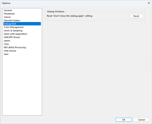 - Click [Reset] to reset the [Don’t show this dialog again] check boxes for all dialogs.