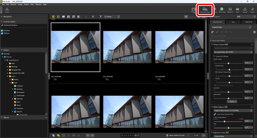 If you choose an image taken using pixel shift and click [Pixel shift merge] in the toolbar, the software will detect the sequence and merge those images into a single file (Pixel Shift Merge).