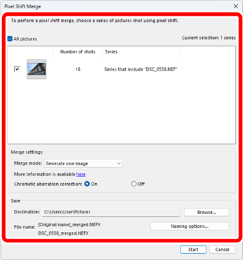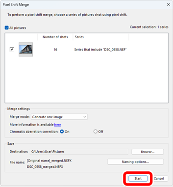 Click [Start] to save the combined image (merged pixel shift image) in the destination folder.