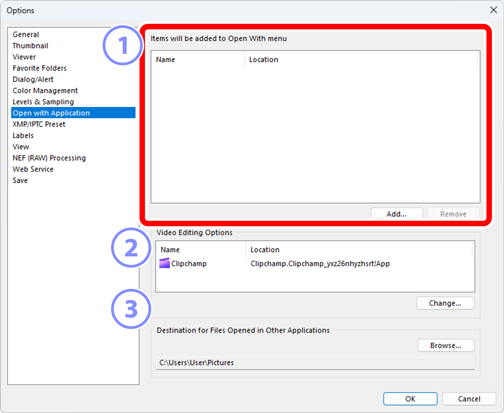 - Choose software used to edit videos. The software included in your operating system is set by default. Click [Change] to select the software you will use to play or edit videos. Only one software application can be used at a time.