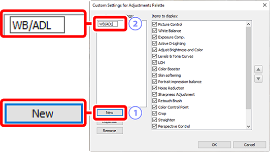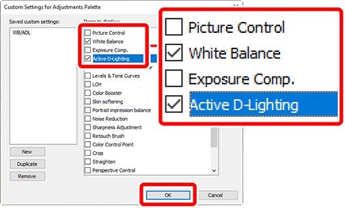 Select the tools that will be displayed in the adjustments palette. You can change the order of the tools using the