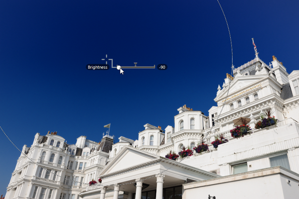 Drag the handles of the adjustment sliders left or right to adjust the selected color. The illustration shows the [B] (brightness) slider being used to adjust the brightness of the sky. The effect applies only to the blue of the sky, leaving the color of the building unaffected, and diminishes with the distance from the control point.