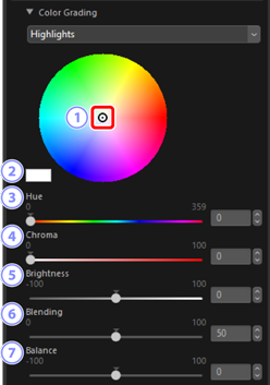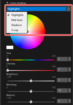 Adjust the tint and brightness for highlights, mid-tones, and shadows. Select the color to be applied from the color wheel and the [Hue] and [Chroma] sliders.