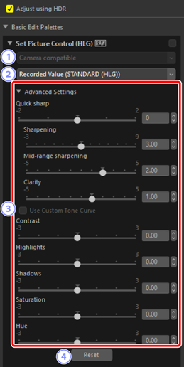 Enabling or disabling [Adjust using HDR] resets all Picture Control settings.