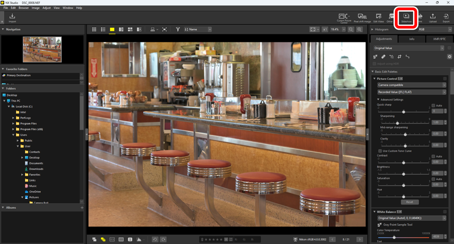 To view the current selection or the pictures in the current folder in a slide show, click [Slideshow] in the toolbar.