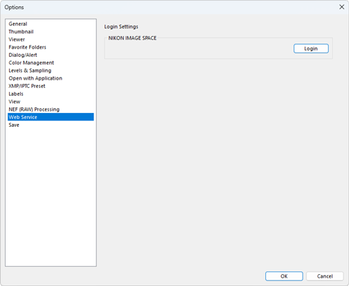 Click [Login] to display the Nikon ID login dialog. Enter your Nikon ID and password to log in to NIKON IMAGE SPACE. If you don't have an ID for NIKON IMAGE SPACE, follow the on-screen instructions to obtain one.