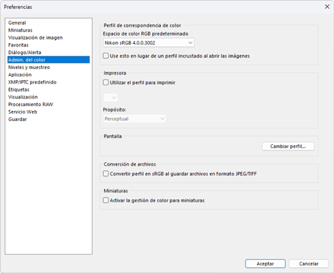 [Espacio de color RGB predeterminado] (Windows)/[RGB predeterminado] (macOS): Seleccione el perfil RGB predeterminado.