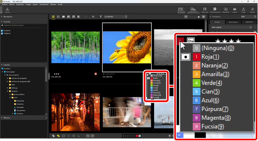 Las etiquetas elegidas después de seleccionar múltiples imágenes con la tecla control (o en macOS, el comando) o la tecla Mayús se aplican a todas las imágenes de la selección.