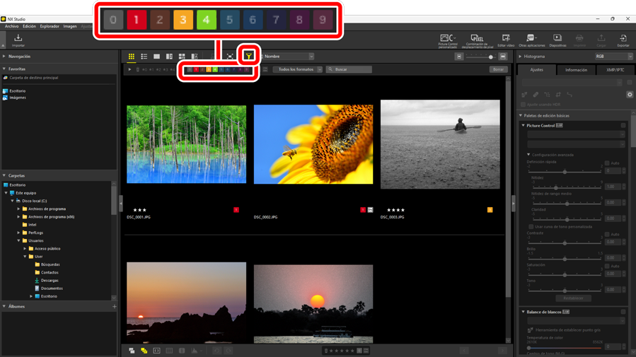 Un filtro que muestra las imágenes etiquetadas 1, 3 y 4