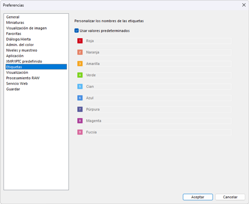 - Seleccione [Usar valores predeterminados] para utilizar los nombres de etiqueta predeterminados. Cancele esta opción para seleccionar nombres personalizados de las etiquetas.