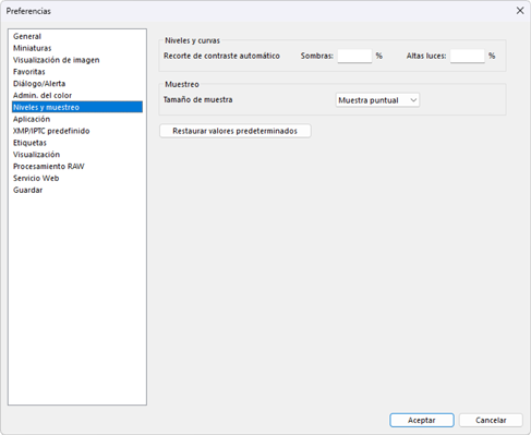 Los ajustes de esta categoría se aplican a los [Niveles y curvas] y herramientas de muestreo.
