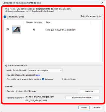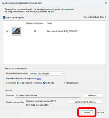 Haga clic en [Iniciar] para guardar la imagen combinada (imagen de desplazamiento de píxeles combinada) en la carpeta de destino.