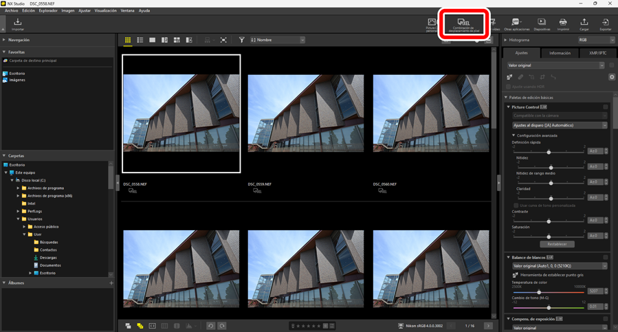 Si selecciona una imagen capturada usando el desplazamiento de píxel y hace clic en [Combinación de desplazamiento de píxel] en la barra de herramientas, el software detectará la secuencia y combinará las imágenes en un solo archivo (Combinación de desplazamiento de píxeles).