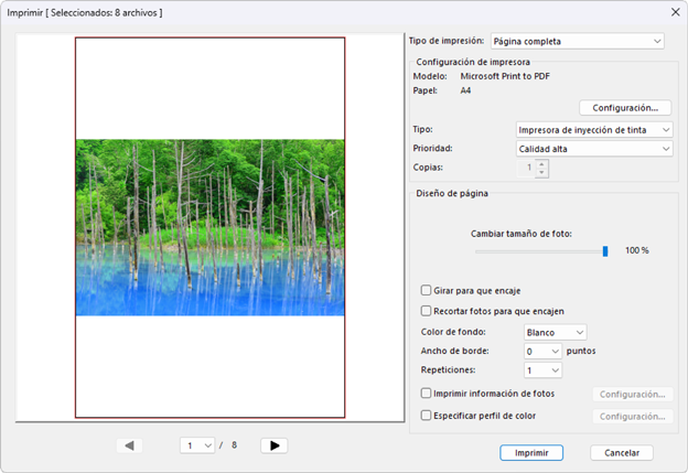 - [Página completa]: Imprime una imagen por página.