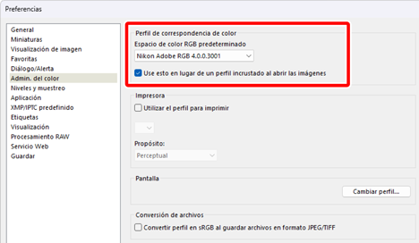- Si solamente selecciona [Use esto en lugar de un perfil incrustado al abrir las imágenes], el perfil [Espacio de color RGB predeterminado] (o en macOS, [RGB predeterminado]) será incrustado en las imágenes durante la exportación.