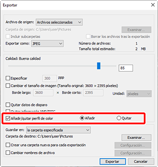 - Si se seleccionan ambos, el perfil de color sRGB será incrustado en las imágenes durante la exportación.