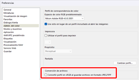 - Si únicamente selecciona [Convertir perfil en sRGB al guardar archivos en formato JPEG/TIFF], el perfil de color sRGB será incrustado en las imágenes durante la exportación.