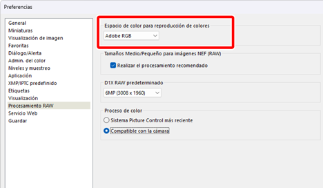 Seleccione la opción deseada para [Procesamiento RAW] > [Espacio de color para reproducción de colores] en el cuadro de diálogo de preferencias (0 El cuadro de diálogo de preferencias, [Procesamiento RAW]).