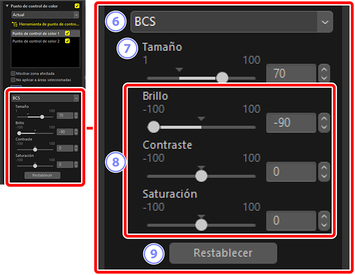 ). Estos controles deslizantes se utilizan para ajustar los colores y seleccionar la zona sobre la que se aplicarán los ajustes.