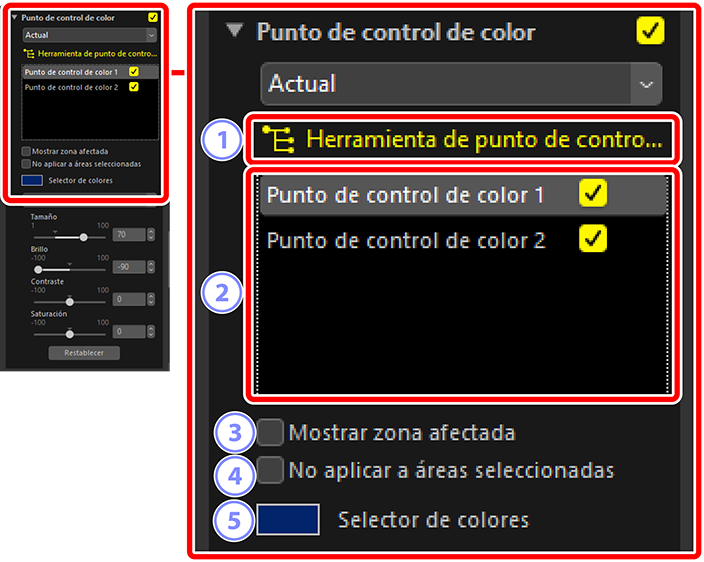Al colocar un punto de control de color (), NX Studio detecta automáticamente el color en el punto seleccionado y elige todos los colores similares en el área circundante. El efecto se controla mediante controles deslizantes: un solo control deslizante de tamaño (