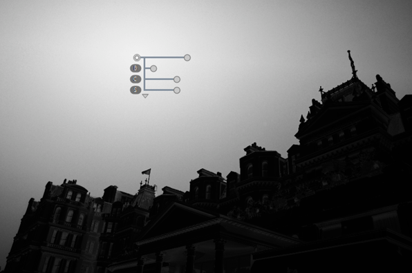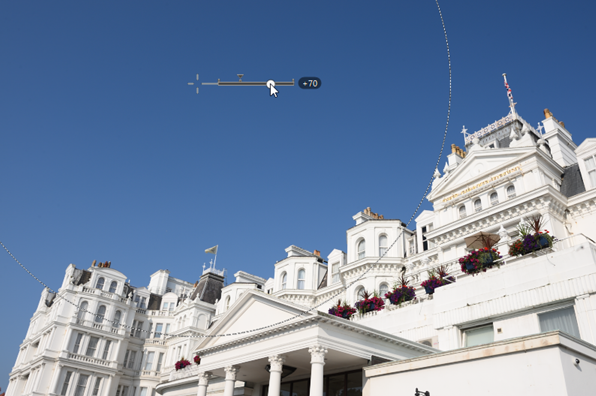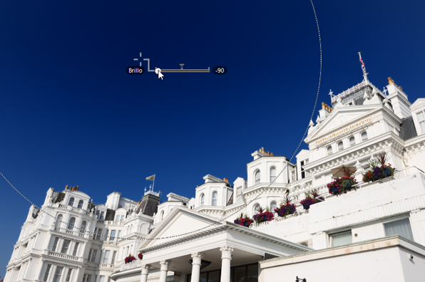 Arrastre las asas de los controles deslizantes de ajuste hacia la izquierda o hacia la derecha para ajustar el color seleccionado. La ilustración muestra el control deslizante [B] (brillo) que se está utilizando para ajustar el brillo del cielo. El efecto se aplica solo al azul del cielo, sin afectar al color del edificio, y disminuye con la distancia desde el punto de control.