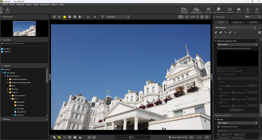 Ilumine, oscurezca o modifique selectivamente los colores. NX Studio detecta automáticamente los colores en el punto seleccionado y aplica los ajustes únicamente a los colores similares de la zona circundante. Esta herramienta no se muestra si [Ajuste usando HDR] está habilitado.