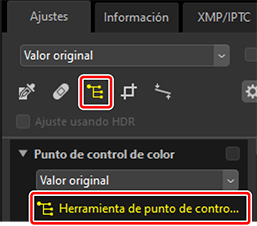 ) la herramienta de punto de control de color. También puede hacer clic en el icono de la herramienta en la parte superior de la paleta de ajustes.