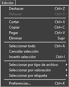 Mueva la imagen o carpeta actual a la papelera de reciclaje (o en macOS, papelera). Seleccionar esta opción al seleccionar una carpeta en la lista de paletas del navegador [Favoritas] elimina la carpeta seleccionada de la lista de favoritos.